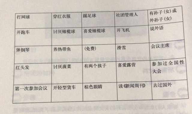 要求人们拿着事先准备好的宾戈牌或纸片(形式见下图)在房间里走动,直到他们找到一个符合宾戈牌或纸片上的描述的人。然后请那个人在纸上的适当位置签上自己的名字。